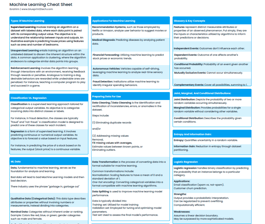 Accelerate your machine learning journey with our concise cheat sheet, packed with algorithms, guides, tips, and examples. Download now!